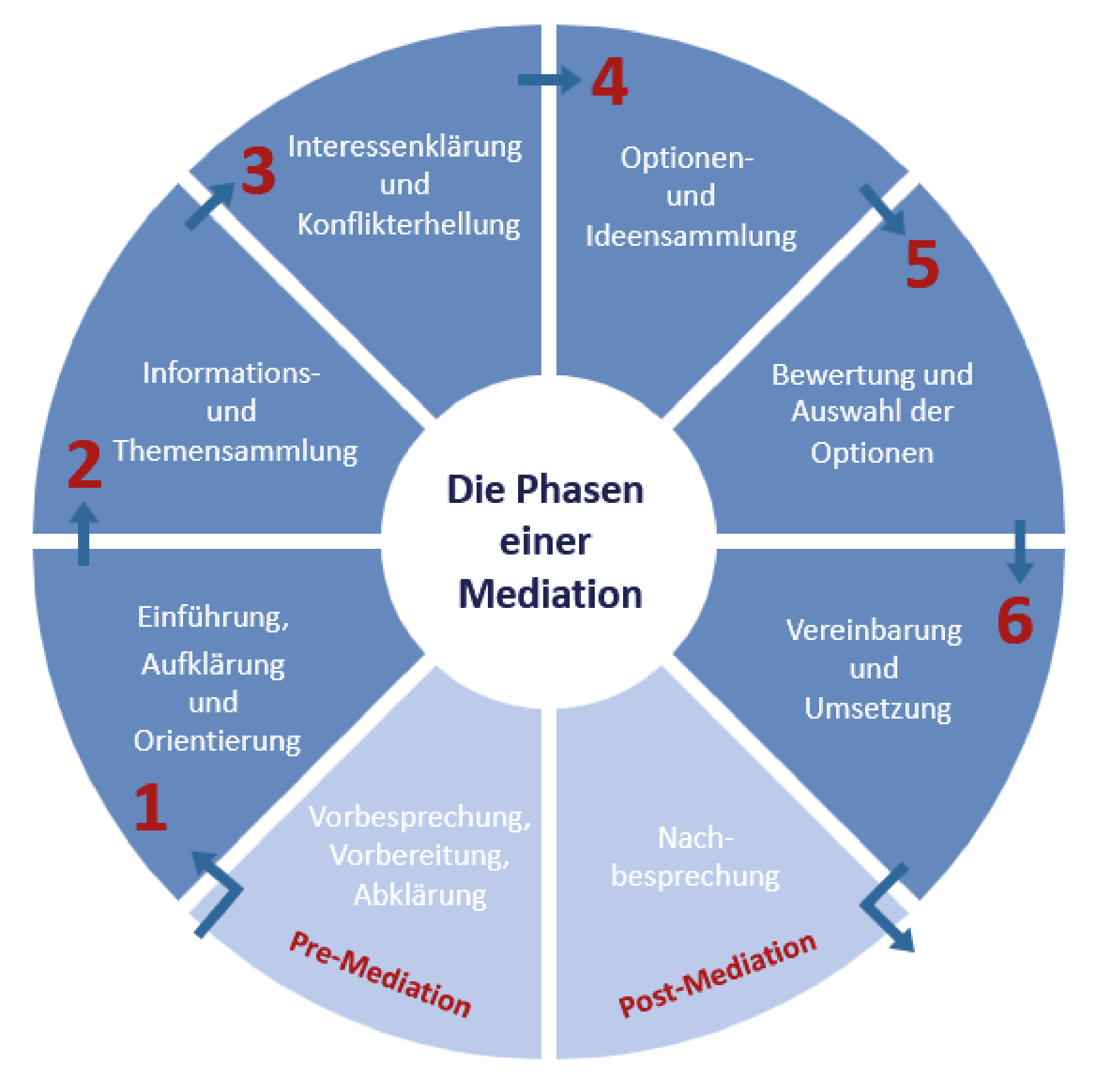 Die erste Phase leitet die Mediation ein und schafft vor allem Transparenz für alle Beteiligten über den Prozess und dessen Beteiligte. Sie dient somit der Auftragsklärung und der Orientierung.